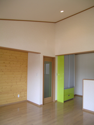 リビングダイニング。アクセントに壁の一部にパイン材を張り、ナチュラル色で塗装をしました。